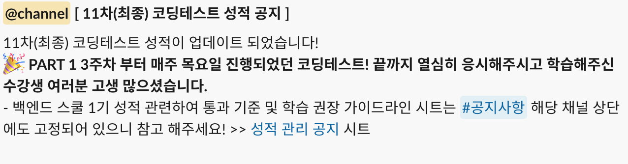 매주 코딩테스트 점수는 공지사항으로 알려줘 현재 내 점수가 어느 수준인지 알수 있게 할 수 있다.