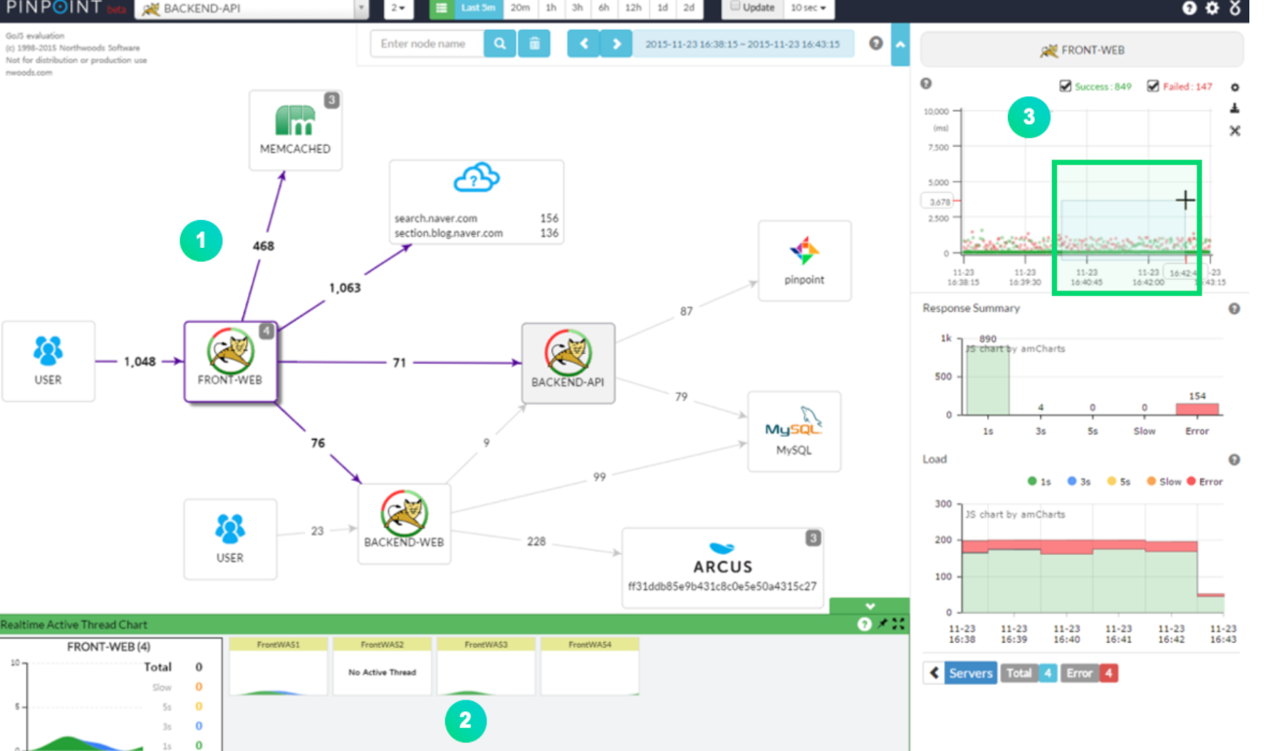 핀포인트를 실제로 어디서 어디로 서버들이 통신하고 있는지, 한번에 파악할 수 있도록 시각화 해주는 대시보드를 제공합니다.