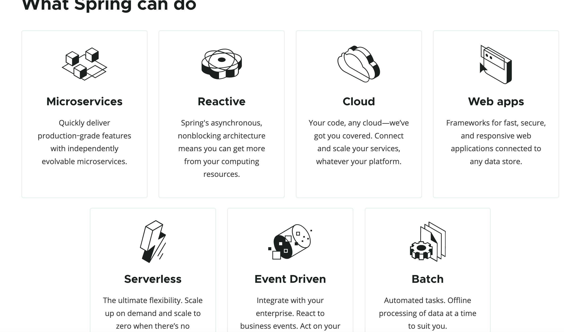 스프링 홈페이지를 보면 Web apps 말고도 다른 기능들은 엄청나게 많다.