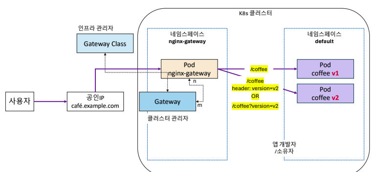 쿠버네티스 게이트웨이 에이피아이을 사용하게 되면 기존에 Ingress 는 gateway로 변경이 되며, service는 위에 route 라는 개념이 한개더 생기면서 분기처야하는 조건들을 적는 역할을 하게 된다.